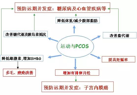 运动的主要益处是降低体重、改善糖代谢、减轻胰岛素抵抗;间接益处是降低雄激素水平和作用,改善内分泌,恢复生育力。降低体重5-10%可以使80%以上的患者恢复排卵,恢复月经和受孕。可以降低雄激素水平,改善高雄激素导致的痤疮和多毛。 看完你一定问:这不是不需要吃药的节奏吗?还真不能这么说!每个人疾病情况复杂、严重程度不等,比如那些雄激素特高的、胰岛素抵抗严重甚至糖尿病了的、着急怀孕的、运动不能坚持的等等,您还是吃药吧!要配合运动! 那运动对非肥胖的PCOS患者有用吗?有用!尽管体重不超重,但这类患者多存在内脏肥胖,因此运动同样有益。 请记住:该病可治疗可控制,这就够了,一切皆可在掌控中!谁能没一两个慢性病,小到鼻炎、痔疮,大到高血压、心脏病、糖尿病,那个能完全治愈了?所以,乐观面对积极控制!别放弃治疗!